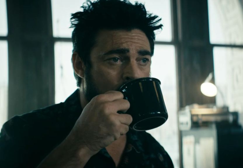 billy butcher drinking coffee. or alcohol.